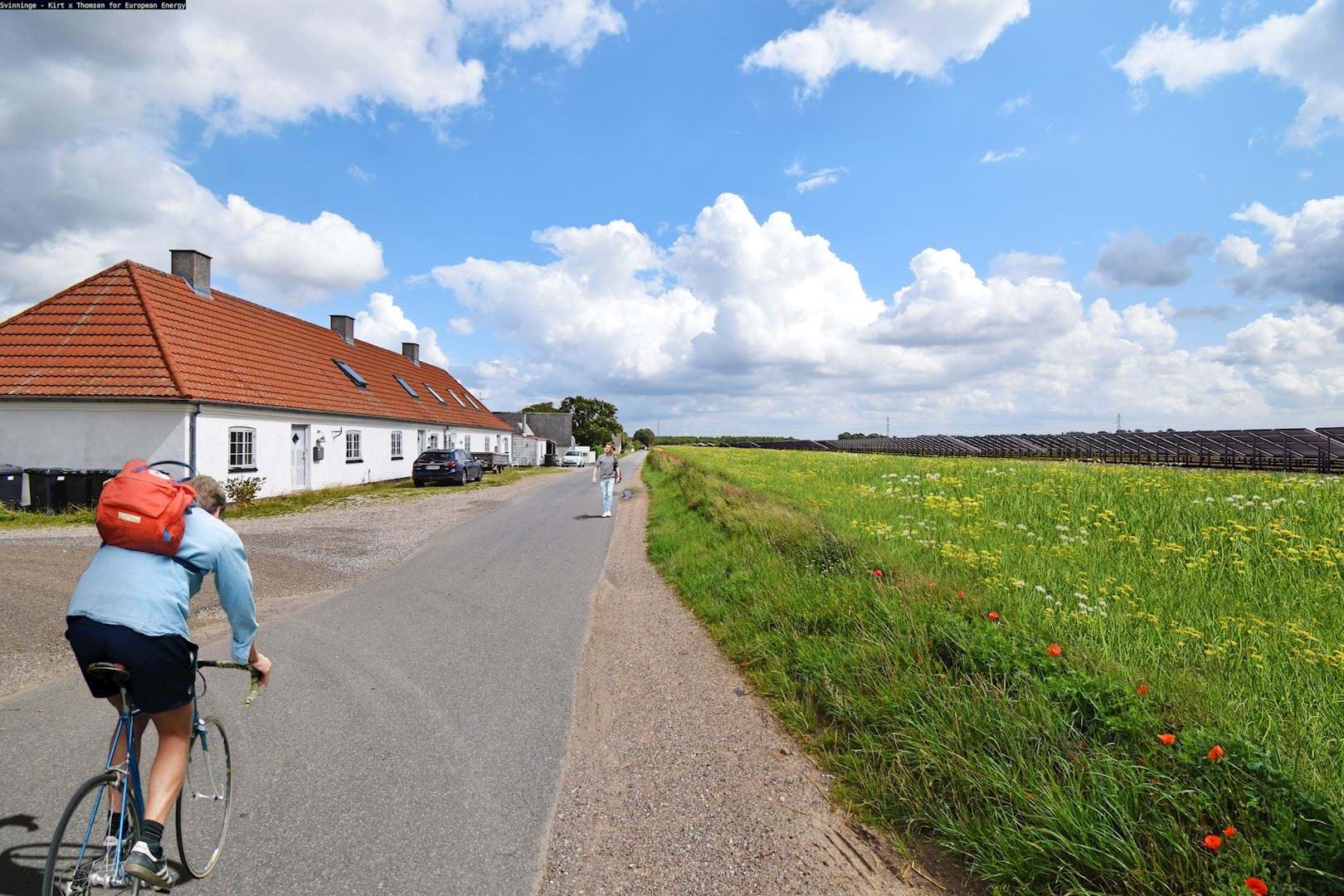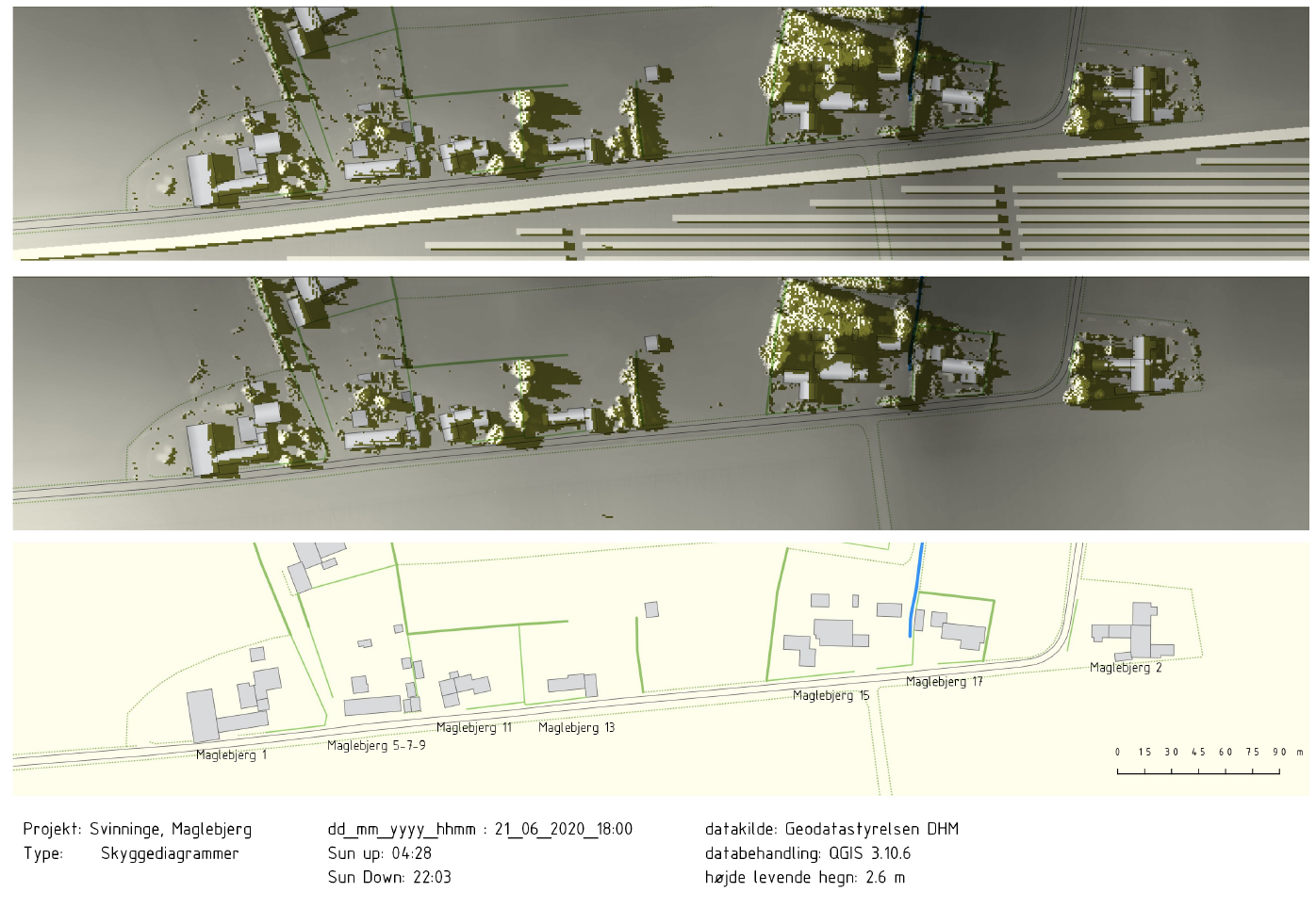 Aften situation den 21. juni kl. 18.00. Skyggerne fra beplantningen og solcellepanelerne kaster ikke længere skygger mod nord, men i stedet væk fra bebyggelsen.