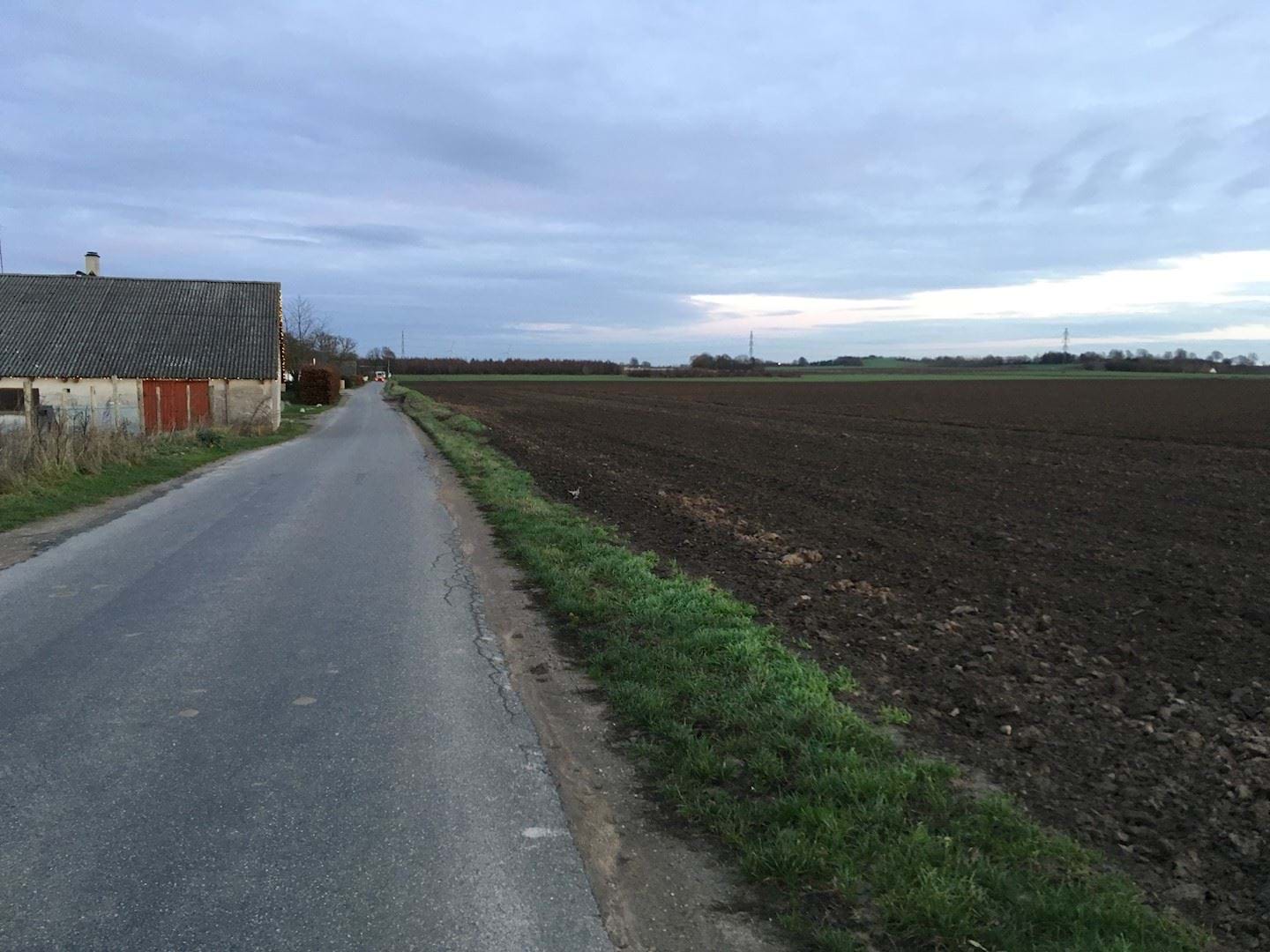 Maglebjerg med bebyggelse og marken, hvor solcelleanlægget placeres. Her ses det svagt faldende terræn fra vest mod øst indenfor lokalplanområdet.