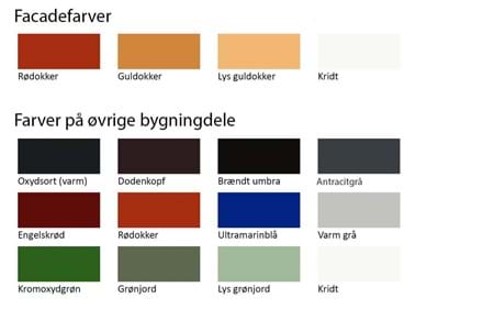 6.13 På al bebyggelse (boliger, fælleshus, skure, evt. carporte) må der kun anvendes jordfarver, som angivet nedenfor, samt i en blanding med sort eller hvidt. Overflader på mindre bygningsdele kan fremstå med andre farvenuancer.