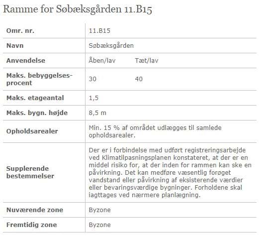 Lokalplanen er i overensstemmelse med kommuneplan 2013-2015. Lokalplanområdet er beliggende i rammeområde 11.B15. Området er beliggende i byzone og skal forblive i byzone. Rammeområde 11.B15 giver mulighed for åben-lav og tæt-lav boligformål som specificeres til tæt-lav byggeri med en bebyggelsesprocent på maks. 40. Rammen giver mulighed for maksimal bygningshøjde på 8,5 meter i maks. 2 etager (1,5 etage er bruges ikke længere). Mindst 15% af området skal udlægges til samlede opholdsarealer.