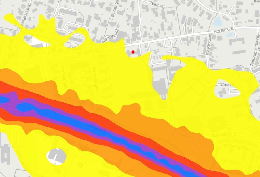 På kortet nedenfor ses en måling af støj fra Skovvejen. Den gule farver viser grænseværdien 55-60 db.