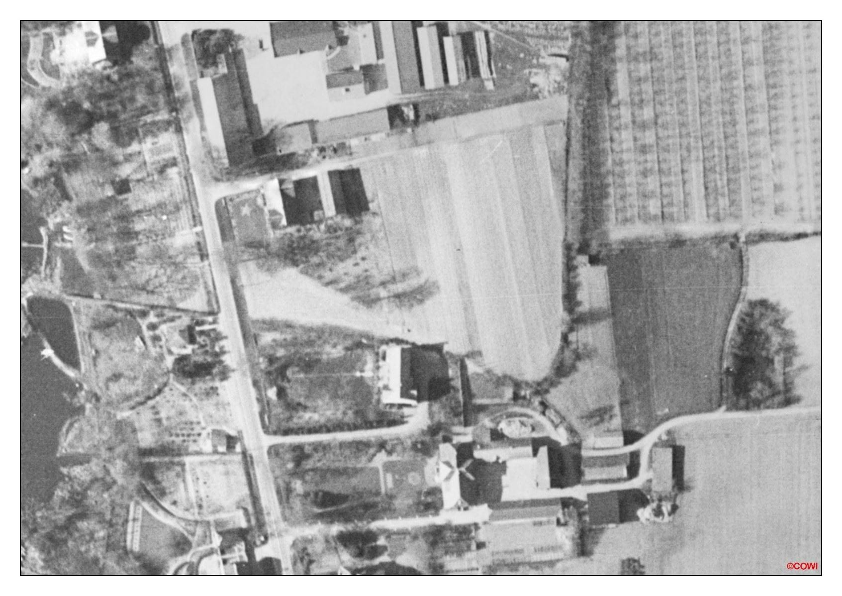 Foto af lokalplanområdet fra 1954 med hovedhuset, bygget Baron Carl Haxthausen.