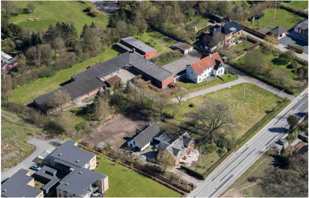 Skråfoto af hovedhuset og områdets bagvedliggende bygninger.