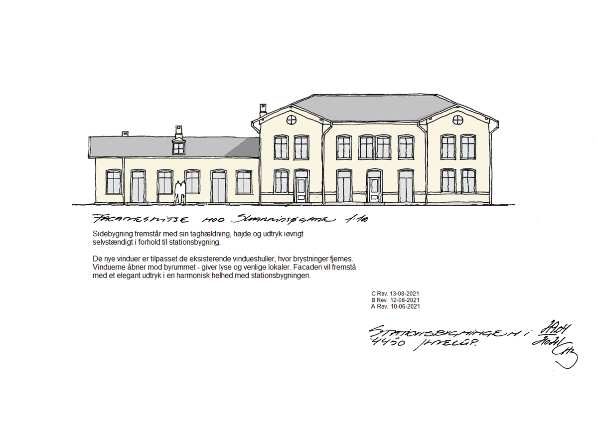 Facadetegning af ny indretning af stationsbygningens vestre længe til butiksformål.