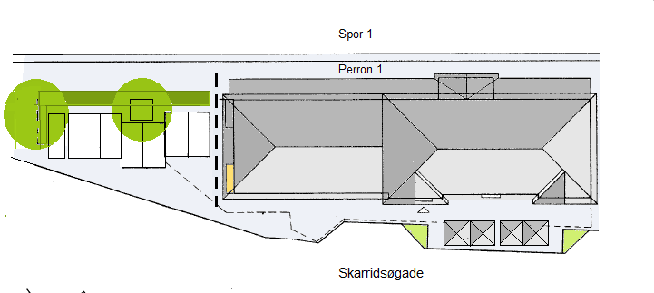 Hovedindgang/offentlig adgang til stationsbygningen gives fra Skarridsøgade, så perronsiden, så vidt det er muligt friholdes for adgangsdøre.