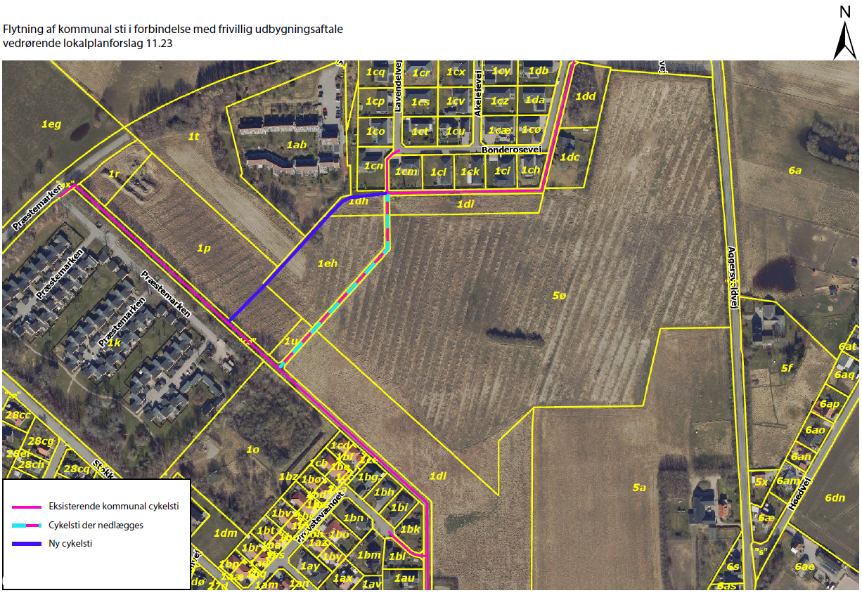 I forbindelse med lokalplanen indgås en frivillig udbygningsaftale jf. planlovens § 21b. Aftalen indgås for at imødekomme grundejers ønske til at udvide sine byggemuligheder, ved at forestå flytning af en del af den kommunale fællessti inkl. belysning langs stien, herunder bekoste udgifterne hertil. Indgåelsen af udbygningsaftalen blev vedtaget samtidig med lokalplanens vedtagelse. Nedenstående kort viser placeringen af den eksisterende kommunale fællessti, samt placering af ny fællessti, der forsat vil være offentlig tilgængelig.