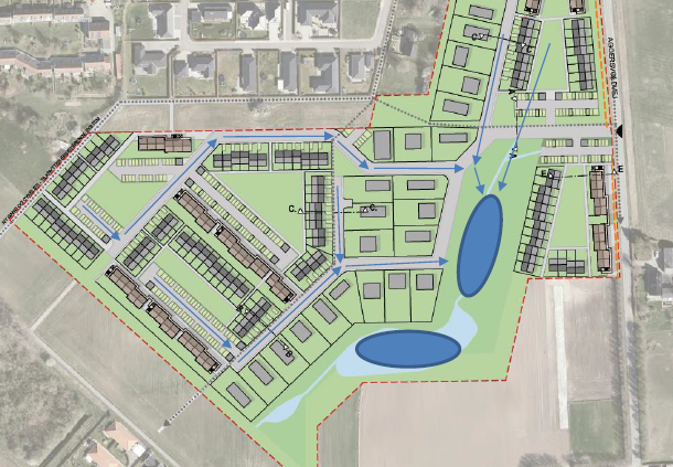 Skybrudssikring: I terrænplanen for området indarbejdes en skybrudsstruktur, som ved store regnhændelser leder vand fra boligområdet via vejene til de grønne områder. Nedenfor vises den overordnede skybrudsstruktur. Skybrudsvejene (blå pile) skal have et mindstefald på 5‰ mod grønne områder.