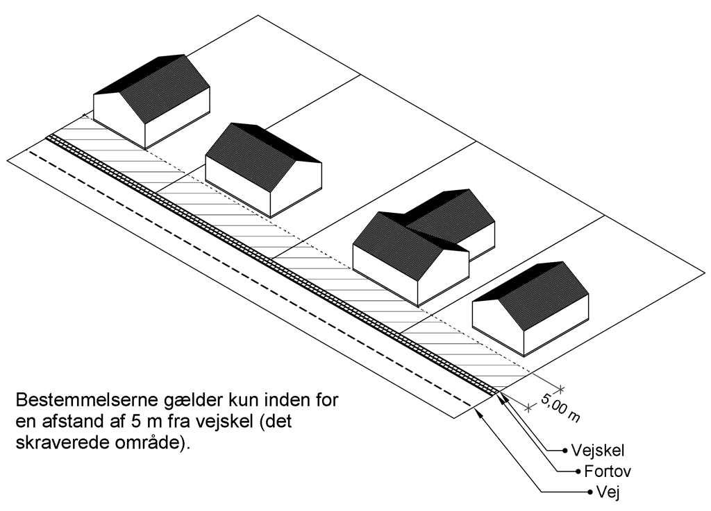 For at sikre et grønt vejbillede reguleres hegning langs vej, ligesom der fastsættes bestemmelser for hvor bebyggelse må placeres i forhold til vej. Derudover er der bestemmelser for, hvordan carporte langs vejen kan placeres og skal se ud. Med bestemmelserne sikres det, at det private areal ud mod vejen friholdes for dominerende bebyggelse og høje faste hegn. Dette område vil i stedet have karakter af et delvist åbent og grøn vejforløb, hvilket bidrager til oplevelsen af et grønt og fællesskabsorienteret boligområde.