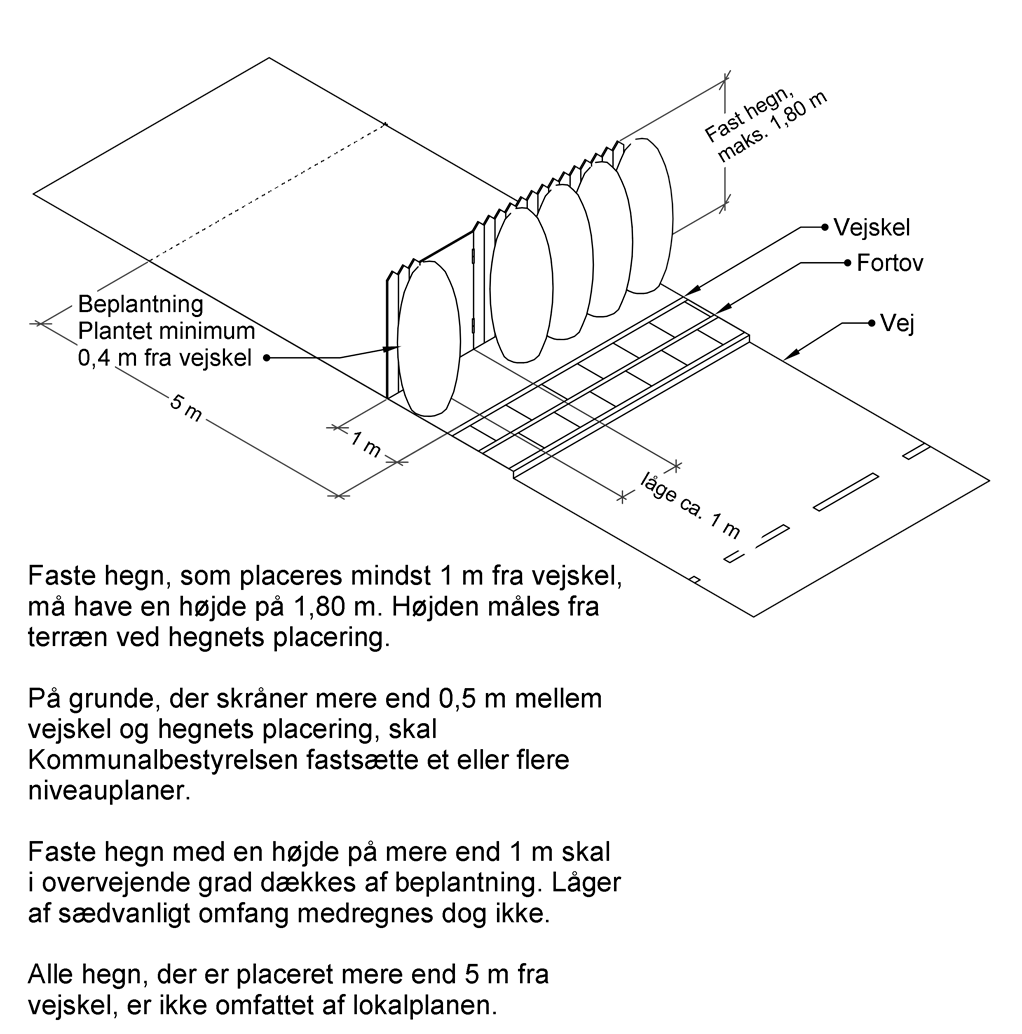Faste hegn med en samlet højde på mere end 1 m skal rykkes mindst 1 m tilbage fra fra vejskel og skal i overvejende grad dækkes af beplantning. Hegnet må maksimalt være 1,80 m højt målt fra terræn ved hegnets placering. Hegn, der er placeret mere end 5 m fra vej, er ikke omfattet af lokalplanen. For at et fast hegn kan betragtes som i overvejende grad dækket af beplantning, skal hække, buske eller andre typer beplantning dække hegnet, således at kun små, spredte dele af det faste hegn kan ses fra vejen. I vurderingen af, om et hegn i overvejende grad er dækket af beplantning, medregnes ikke låger af sædvanligt omfang.