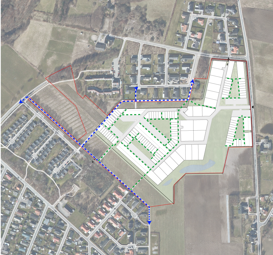 Som beskrevet ovenfor vil stier i lokalplanområdet forbinde til eksisterende stier i området. Dermed gives mulighed for at bevæge sig rundt til og fra naboområder på gåtur, cykel eller lignende. Dette vil øge områdets sammenhæng med de omkringliggende områder. De nye fællesfaciliteter og grønne områder i det kommende boligområde vil også kunne anvendes af beboere fra naboområdet. Nedenfor ses et kort over kommende forbindelser i lokalplanområdet og til de omkringliggende områder. De blå stiplede linjer er de primære forbindelser, mens de sorte stiplede er mulige forbindelser. Grønne stiplede linjer er interne stiforbindelser i boligområdet. Derudover er der fortov langs alle veje inden for lokalplanområdet.