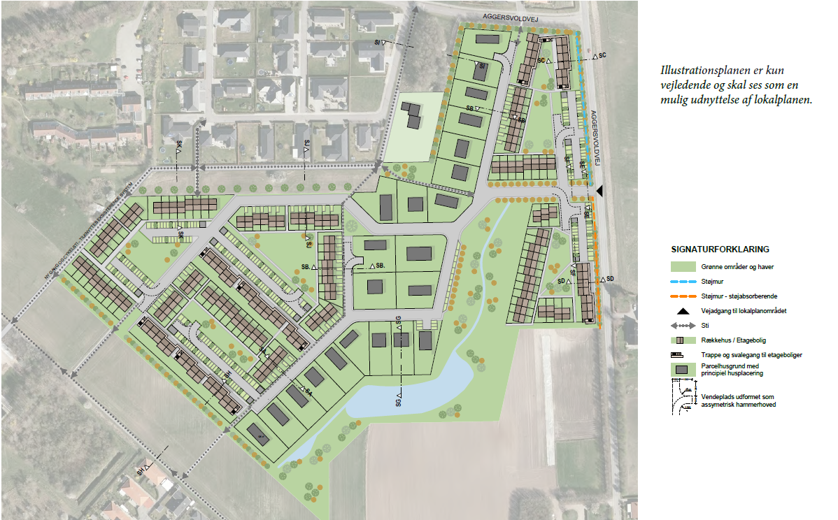 Ud mod Aggersvoldvej skal der opføres et støjhegn for at sikre at boligområdet ikke udsættes for støj over miljøstyrelsens vejledende grænseværdier for trafikstøj i udendørs opholdsarealer.