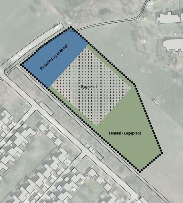 Lokalplanen muliggør etablering af en ny børneinstitution. Områdets overordnede fremtidige arealanvendelse kan ses på kortet nedenfor. Området får vejadgang fra Præstemarken med parkering og ankomstområde ud til vejen. Selve bygningen til børnehuset skal være beliggende indenfor det på kortet angivne byggefelt. Området syd for udlægges til legeområde. Langs kanten af hele området etableres et trådhegn.