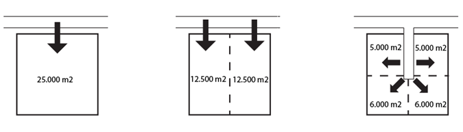 Lokalplanen giver et fleksibelt udstykningsprincip, hvor storparcellerne kan opdeles i flere parceller ved at tilføre ekstra stikveje, som vist herunder. Hvert enkelt storparcel kan således deles i 1-4 parceller alt efter størrelse og behov. Ligeledes kan storparcellerne sammenmatrikuleres ved behov for større grunde. Det giver mulighed en fleksibel udstykning, som kan ændres efter behov. Der kan udstykkes grunde med en minimumsstørrelse på 0,5 ha. (5.000 m2).