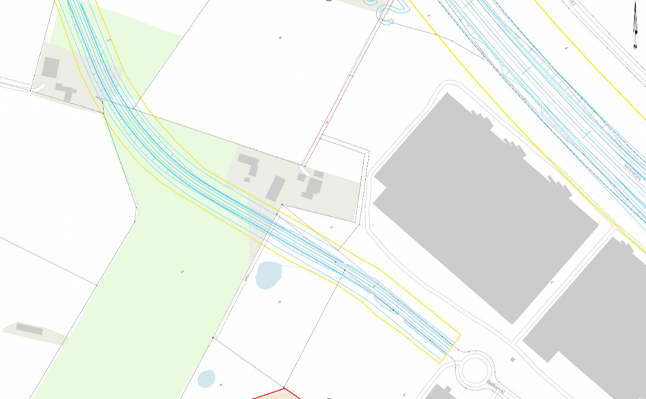 Kortet viser Vejdirektoratets tinglysning af en planlægningsbyggelinje som sikre motorvejsudbygningen ved Skovvejen samt forlængelse af Bødkervej.