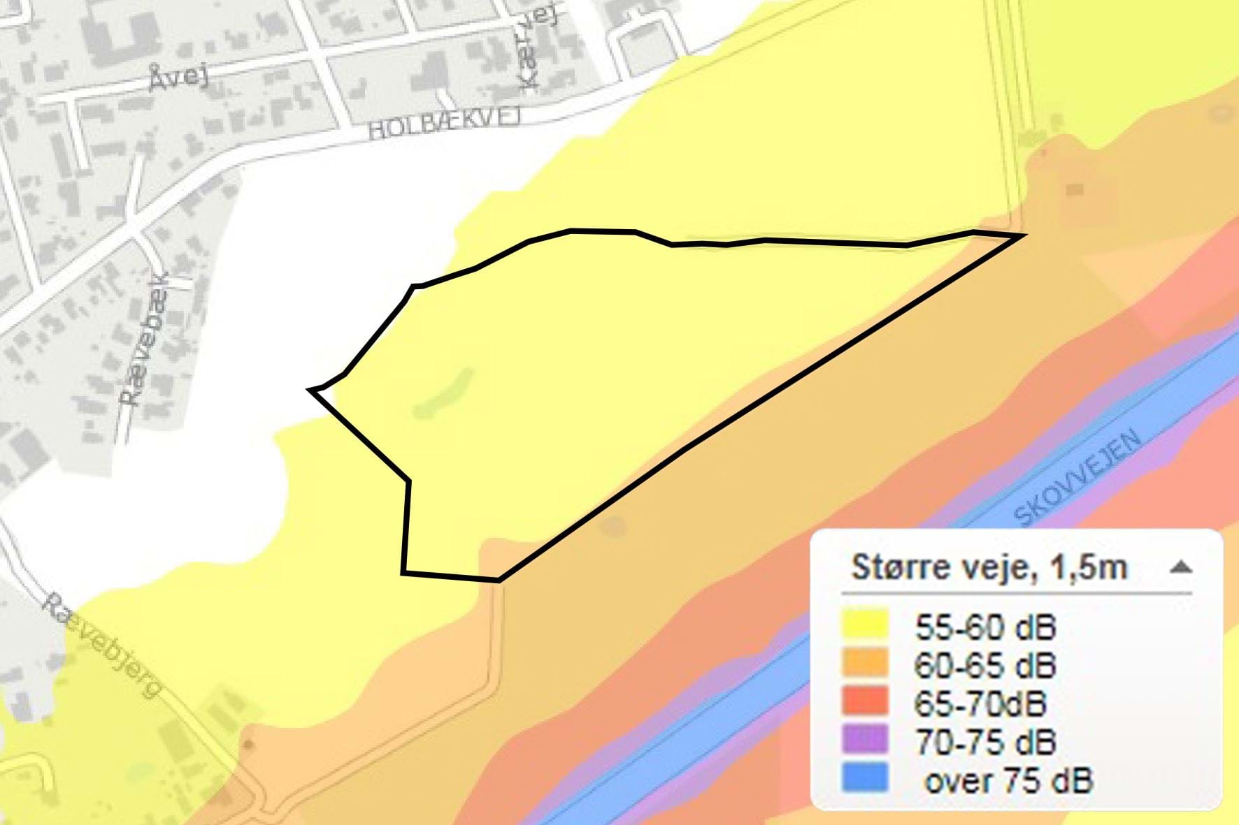 Lokalplanen udlægger området til rekreative formål i form af kræmmermarked og hestesportsevents, som er ikke-støjfølsom anvendelse. Holbæk Kommune sidestiller denne form for rekreativ anvendelse med idræts- og sportsanlæg. Lokalplanområdet ligger 160 m fra Skovvejen, som er en statsvej. Arealet mellem motorvejen og planområdet dækkes af skovbeplantning.