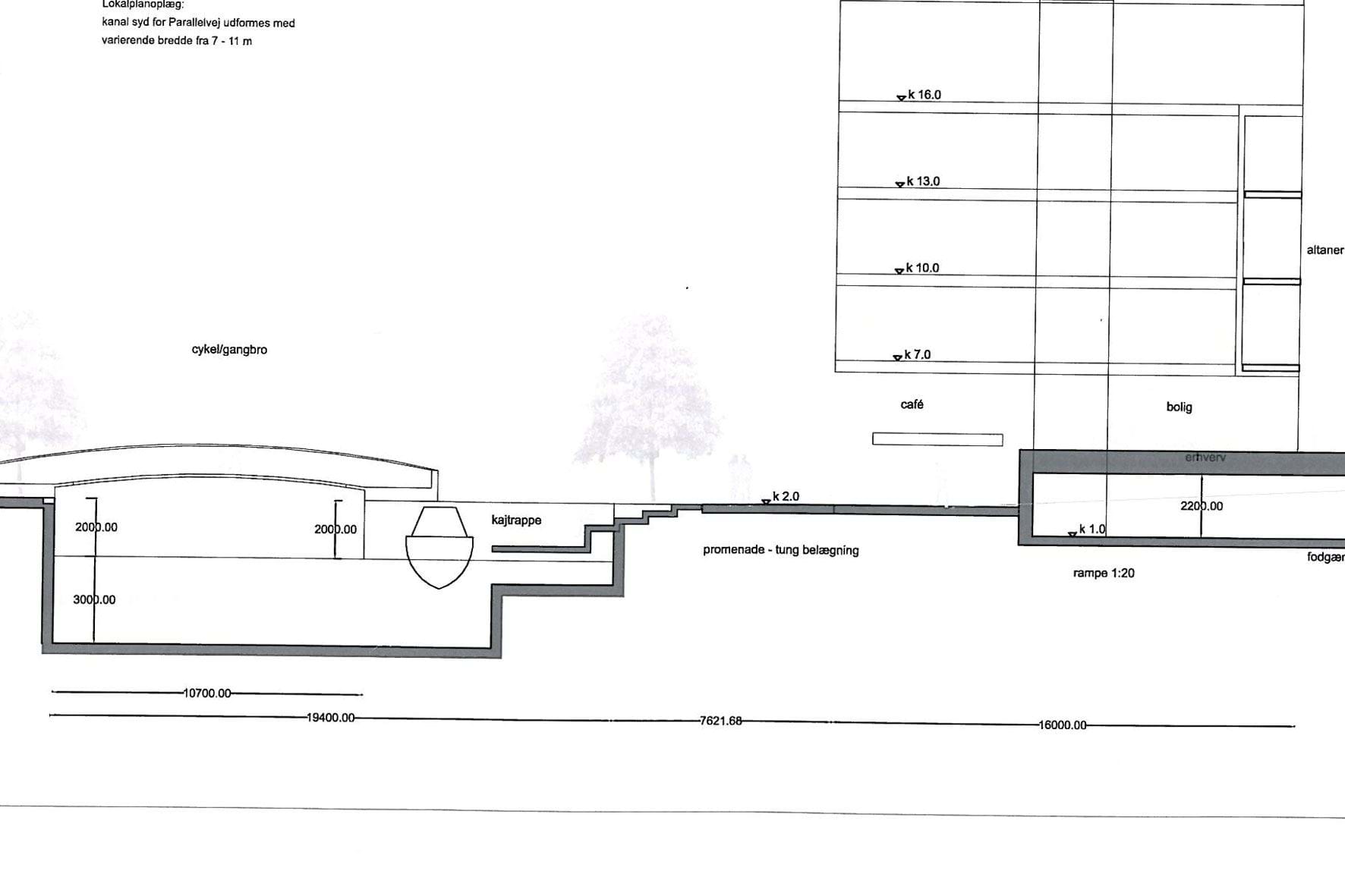 Principsnit af erhvervsbebyggelse med åbenhed og niveaufriadgang mod kanal