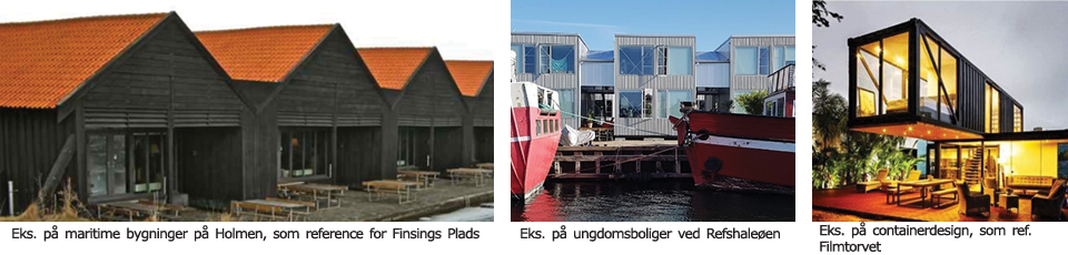 På arealerne, der ligger op mod sejlsportsforeningerne ved Finsings Plads, kan indplaceres ny bebyggelse i maksimalt 1 1/2 etage, med et formsprog inspireret af de eksisterende træbygninger.