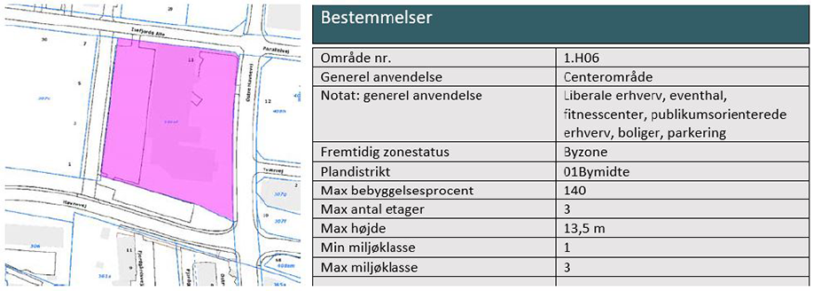 Ejendommen er omfattet af gældende Kommuneplanramme 1.H03. Projektet er i overensstemmelse med kommuneplanrammen for så vidt angår anvendelse, maksimal bygningshøjde, m.v., men overstiger den fastsatte bebyggelsesprocent på maks. 115. Planlægningen forudsætter derfor udarbejdelse af kommuneplantillæg, og der er udarbejdet Kommuneplantillæg nr. 29, indeholdende ny kommuneplanramme 1.H06 for den konkrete ejendom.