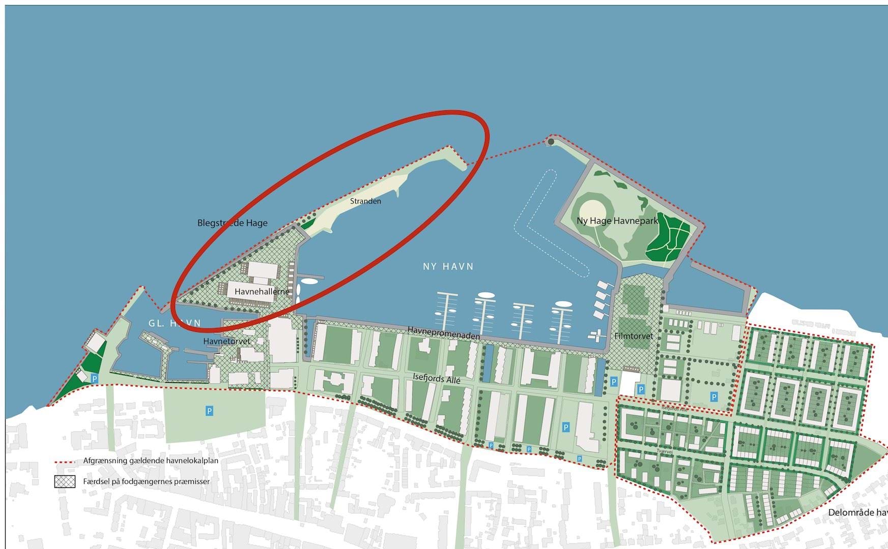 Planområdet rummer, udover de to større erhvervshaller, der anvendes til maritime kulturformål, dels ved Kystlivscentret og ved Nationalmuseet, en offentlig strand, der er et velbesøgt udflugtsmål for byens borgere, samt et eksisterende bådemiljø ved Skudelauget på Blegstræde Hages vestlige hjørne.