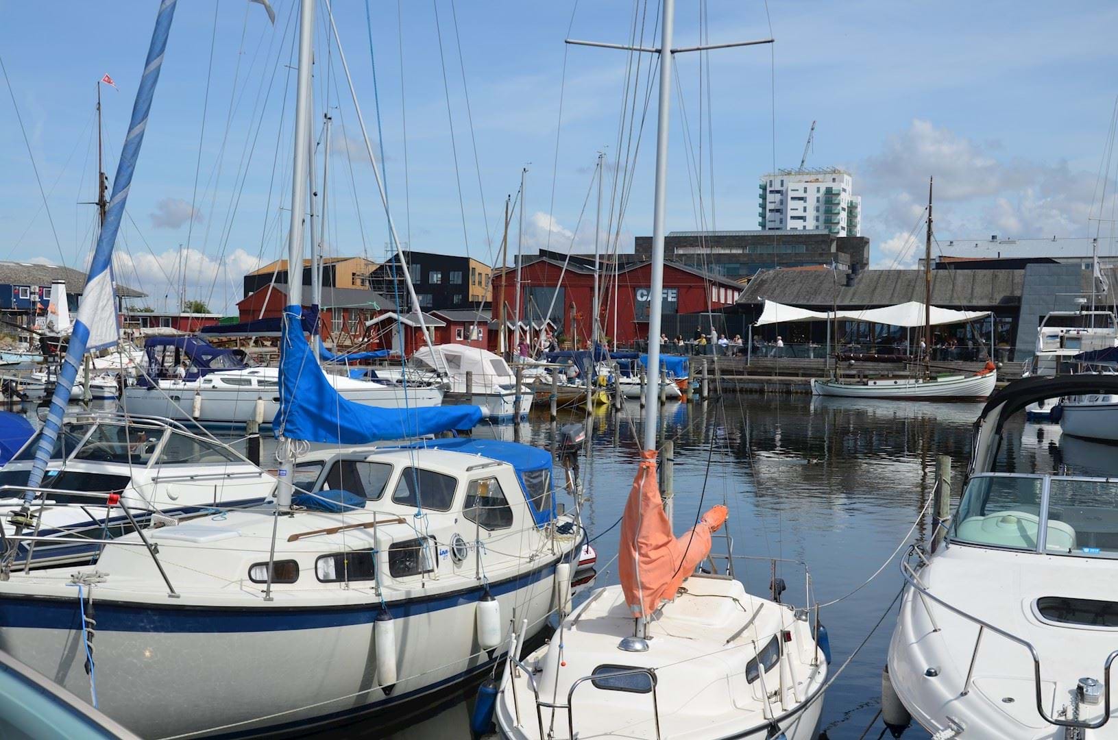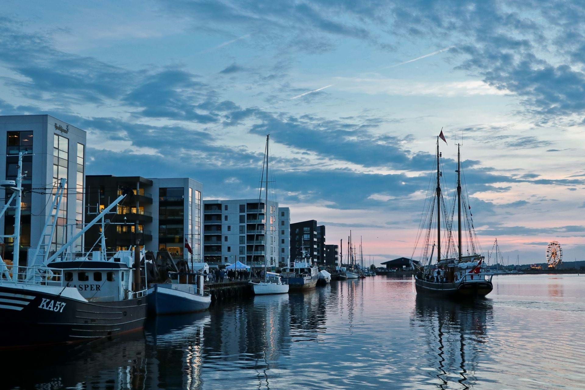 Kig fra Ny havn mod havnehallerne på Blegstræde