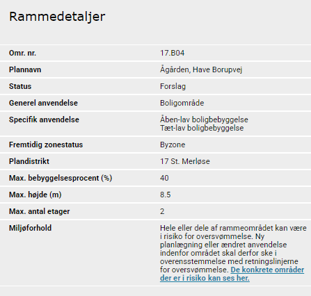 Lokalplanområdet er omfattet af kommuneplanramme 17.B04 Ågården, Have Borupvej, hvor den generelle anvendelse er boligområde med åben-lav og tæt-lav boliger i 2 etager og maks. bygningshøjde på 8.5 meter. Bebyggelsesprocenten er på maksimum 40%, og området er beliggende i byzone.