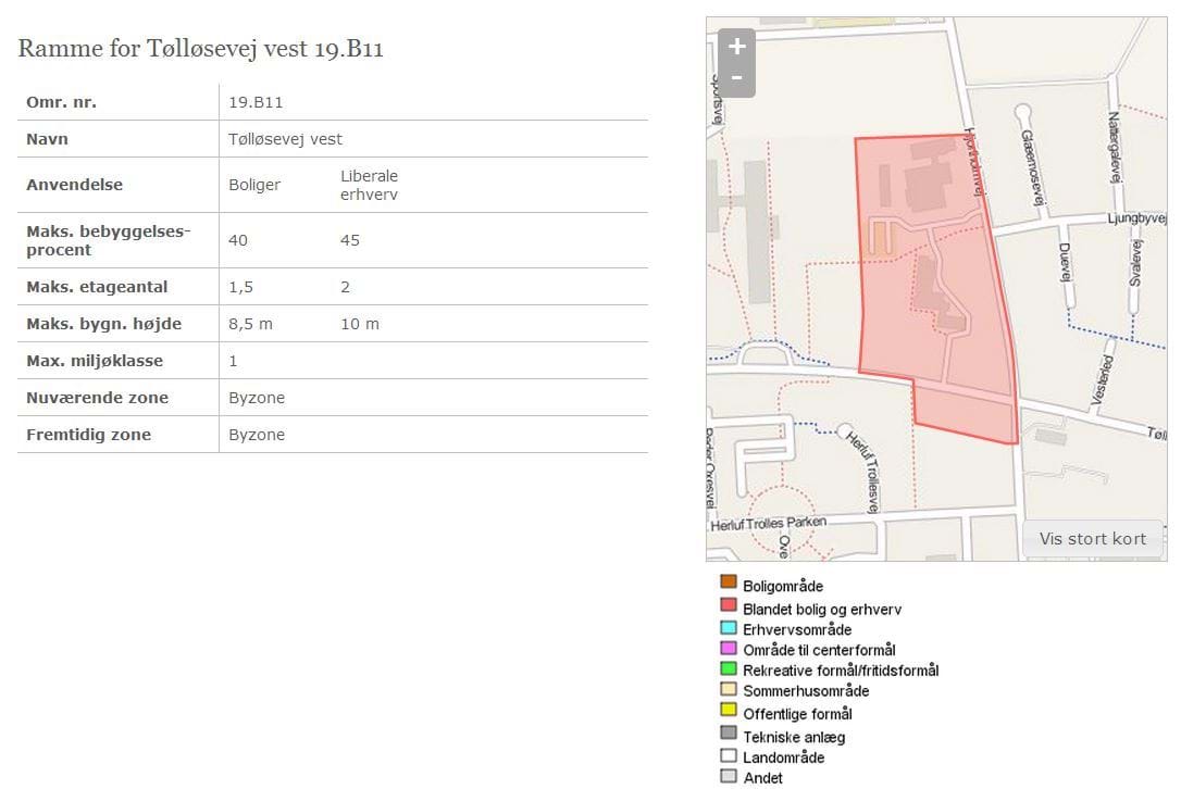 Lokalplanområdet er omfattet af kommuneplanens rammebestemmelser for 19.B11, der udlægger området vest for Hjortholmvej og nord for Tølløsevej til boliger og liberalt erhverv. Lokalplanen er ikke i overensstemmelse med Kommuneplan 2013-25, der udlægger området til boliger i maksimalt 1,5 etage. For at muliggøre indretning af boliger i den eksisterende bygning, er der i forbindelse med udarbejdelsen af lokalplanen udarbejdet et kommuneplantillæg, der ændrer rammen for boligbyggeri således, at der fremover kan opføres boliger inden for rammeområdet i op til 2,5 etager.