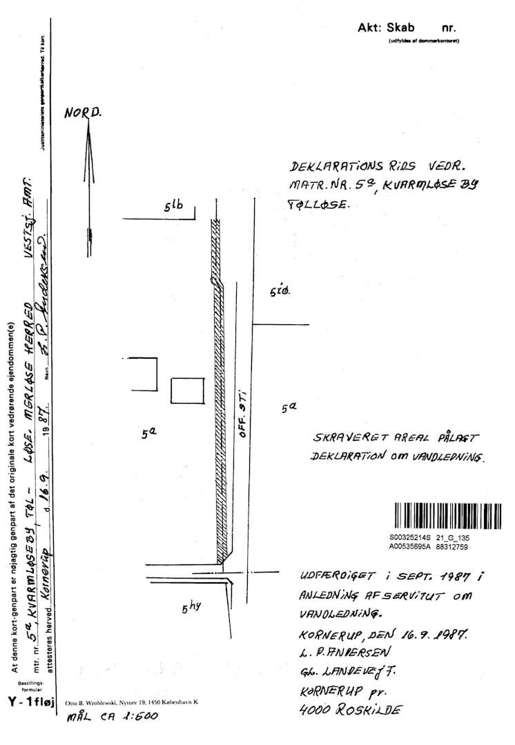 Deklaration om vandledning der løber langs den østlige grænse af lokalplanområdet (vist på kortbilag 2). Påtaleretten har Kvarmløse - Tølløse Vandværks bestyrelse. Servitutten er ikke i strid med lokalplanen og skal respekteres.