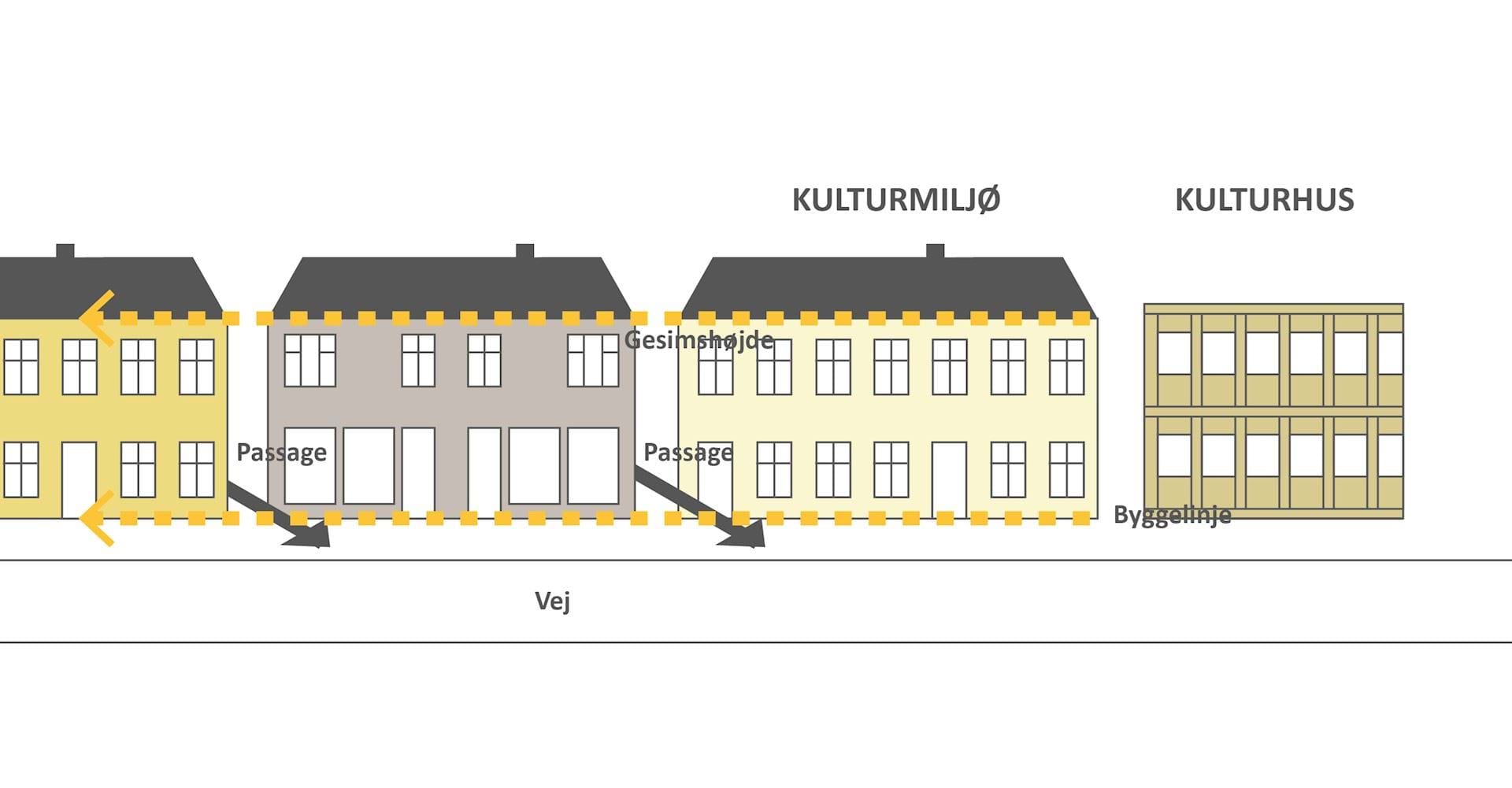 Husrækken mod Jernbanevej er udpeget som kulturmiljø, og derfor fastsætter lokalplanen bestemmelser, som sikrer kulturmiljøets vigtigste karaktertræk, herunder bl.a. bebyggelsens udformning og placering. Ny bebyggelse mod Jernbanevej må kun placeres med bygningens facade i samme byggelinje, som den eksisterende bebyggelse og med en gesimshøjde på 6 meter over terræn, målt efter bygningsreglementets regler, som de eksisterende bygninger. Tage skal etableres som saddeltage med tagryggen parallelt med Jernbanevej.