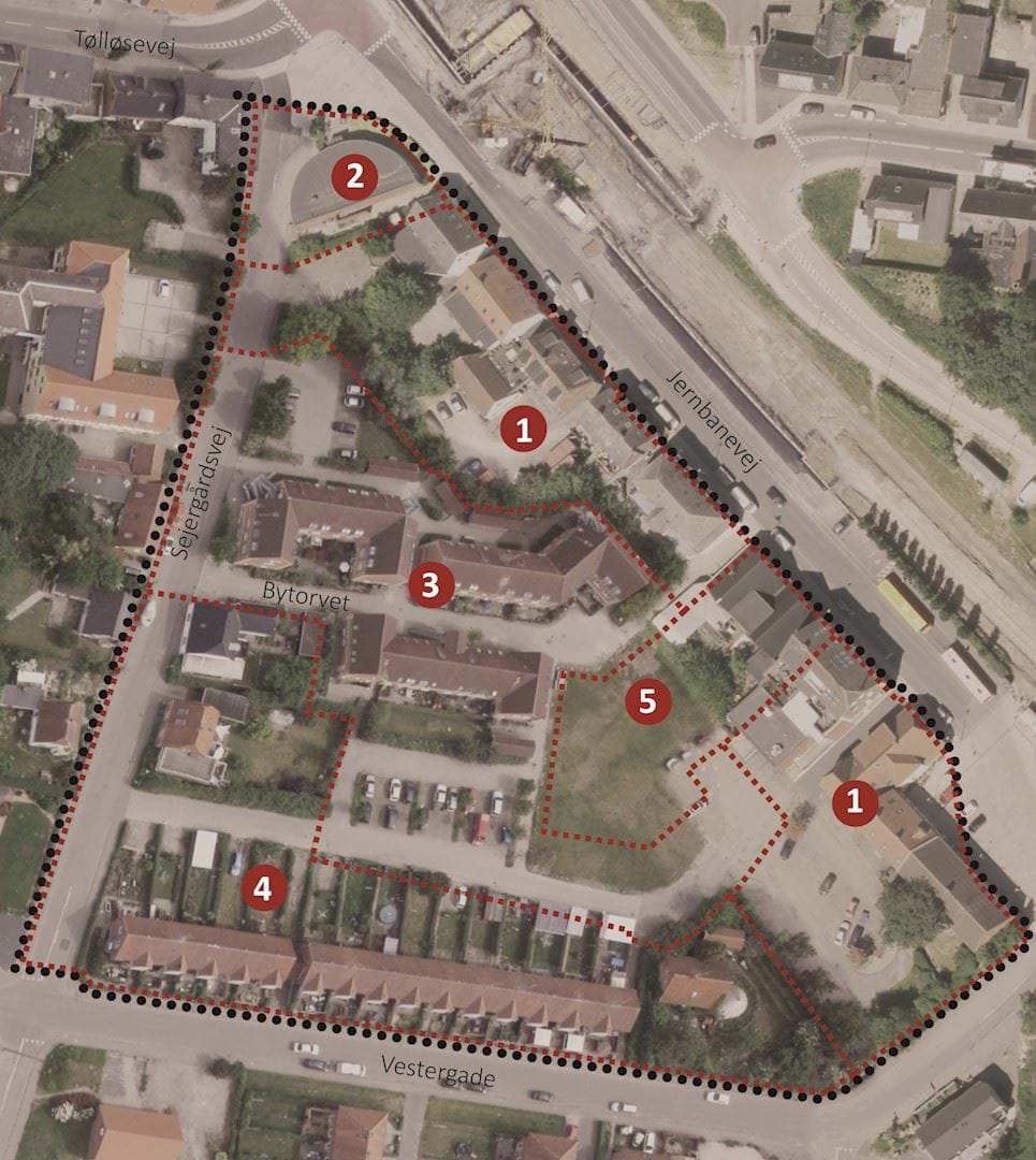 Lokalplanafgrænsningen med de 5 delområder.