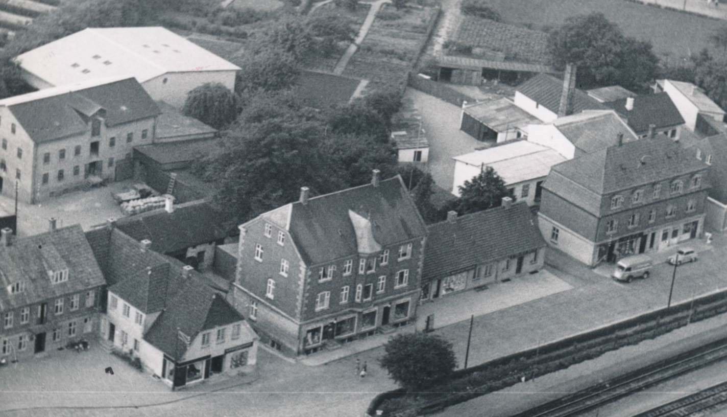 Den tidligere bebyggelse langs Jernbanevej - før nedrivningen af Jernbanevej 14 (delområde 5). Billedet er fra Tølløse Lokalarkiv.
