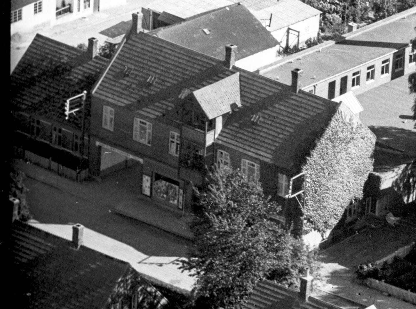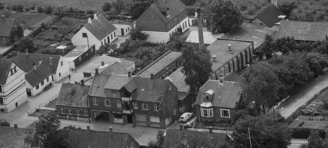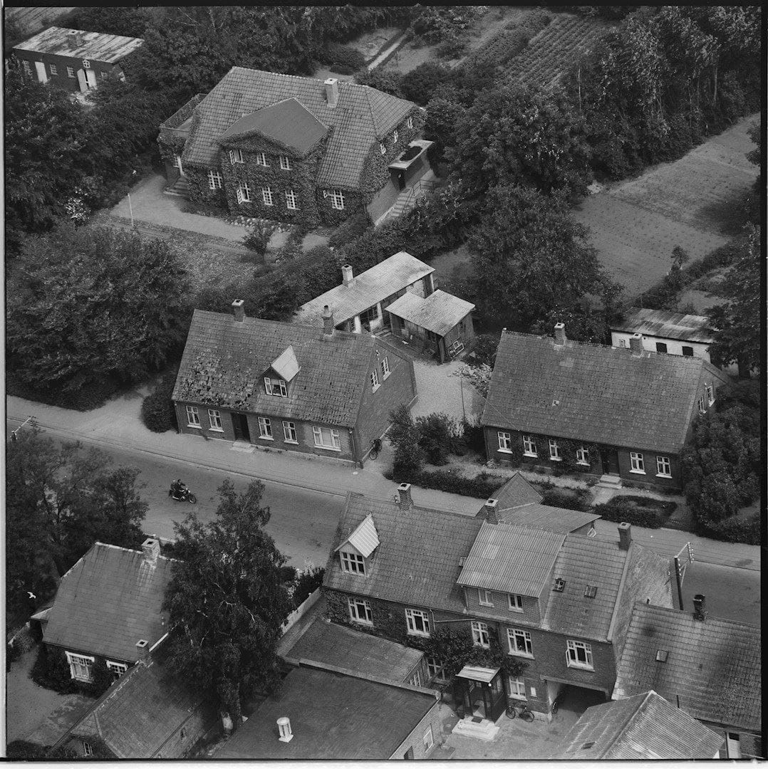 Luftfoto fra 1958 set fra syd, der viser administrationsbygningens gårdmiljø.