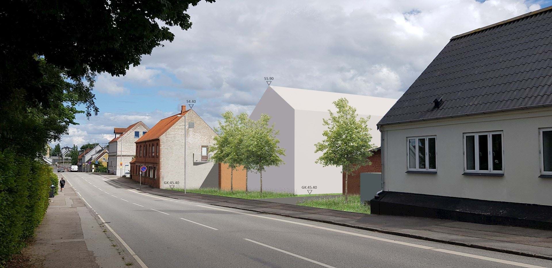 Ovenstående illustrationen viser den nye etagebebyggelses placering i gadeforløbet på Tølløsevej. Bygningen placeres mellem den tidligere administrationsbygning og det tidligere flaskelager.