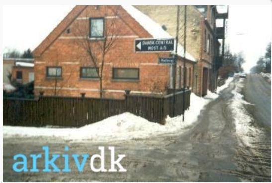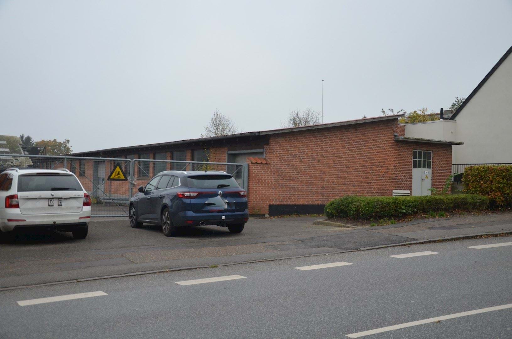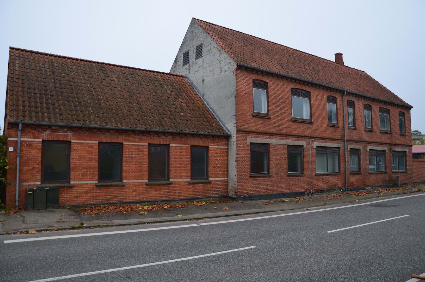 Administrationsbygningen set fra nord. En frontkvist, port og butiksvinduer mod Tølløsevej. På billedet ses de originale dannebrosvinduer.