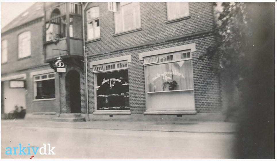 Fra 1937-38 bagerbutik, bygningen fremstår med betonoverligger og murværksdetaljer. Der har været dør ud mod vej og detaljeret altan på.