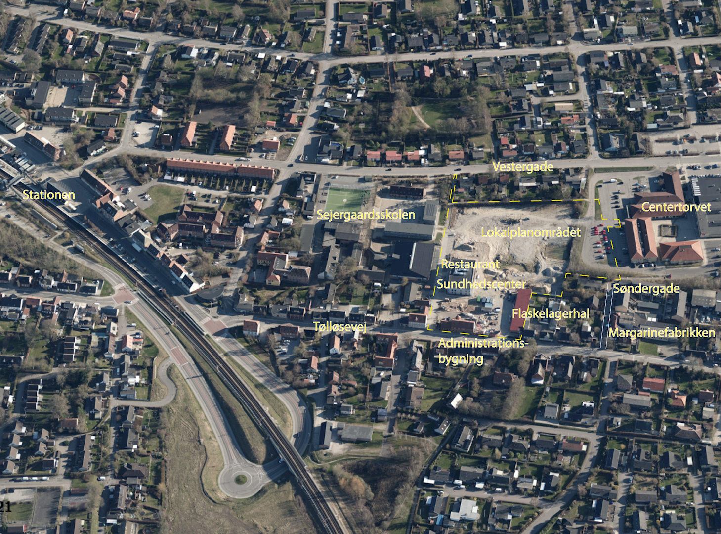 Skråt luftfoto af området for lokalplanen, set mod syd. Stationen kan ses til venstre i billeder, mens centertorvet kan ses til højre i billedet. I mellem disse ligge lokalplanområdet markeret med stiplet linje ved siden af Sejergaardsskolen.