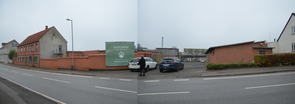 Den tidligere administrationsbygning til venstre i billedet og den tidligere flaskelagerhal til højre i billedet markerer sammen den tidligere indgang til Mostfabrikken.