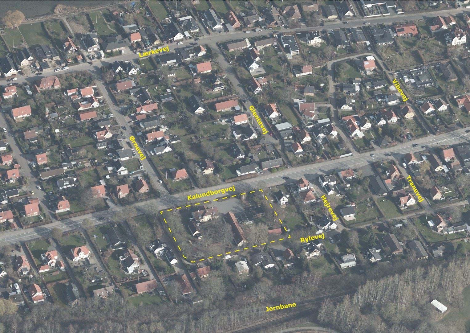 Luftfoto af området for lokalplanen set fra syd. Selve lokalplanområdet er afgrænset af de stiplede linjer. Mod nord anes fjorden, og mod syd løber jernbanen.