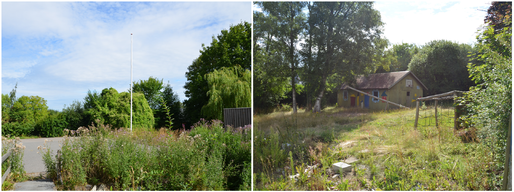 De udendørs arealer som de står i dag. Der er spor efter forskellige brug af arealerne gennem tiden, bl.a. et tidligere haveanlæg og legeplads.