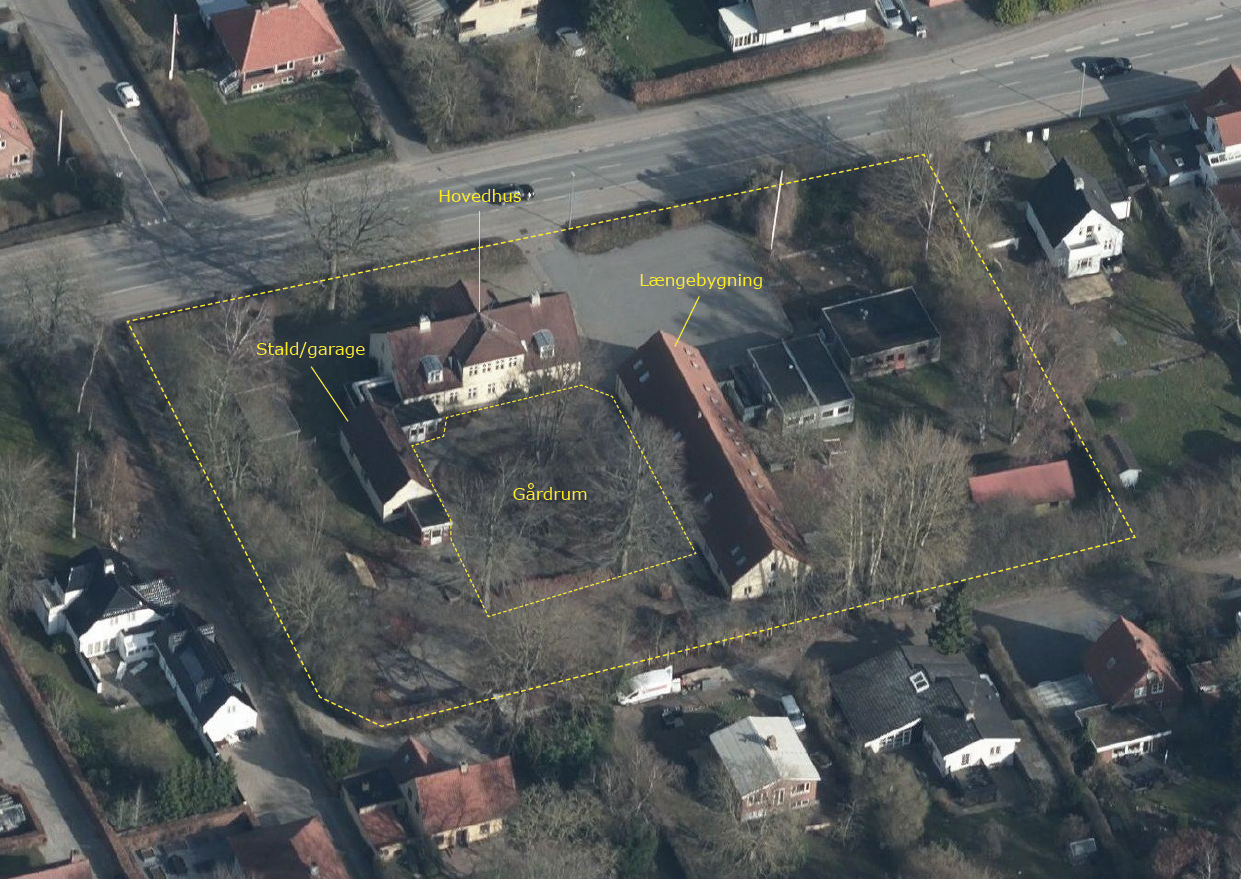 På billedet ses ejendommens tre eksisterende bygninger og gårdrum, samt de forskellige skurbygninger placeret rundt i området.