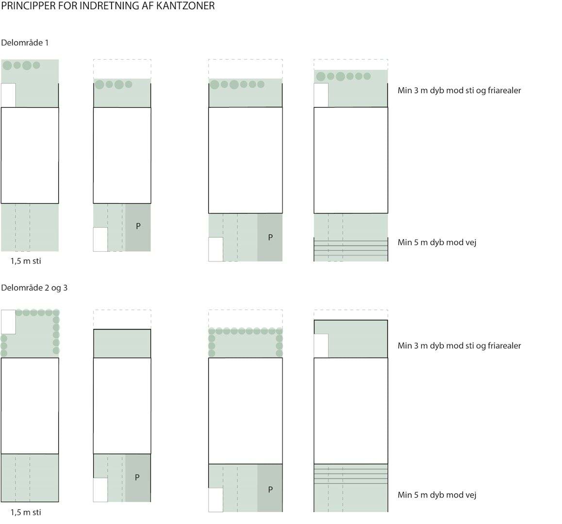 Kantzoner mod vej skal have en dybde på min. 5 m. I delområde 1 kan de dog etableres med en dybde på min. 3 m.