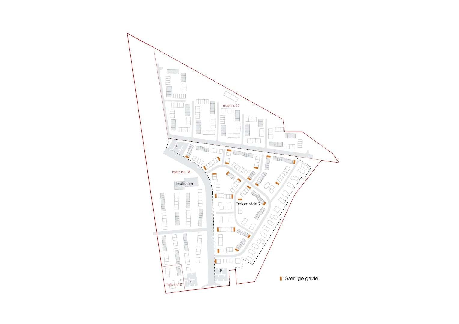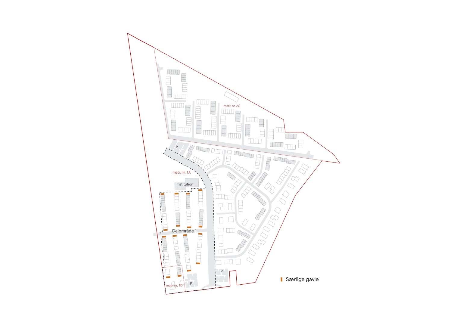 Figur 24: Eksempel på bebyggelsesplan for delområde 1 med placering af særligt bearbejdede gavle.