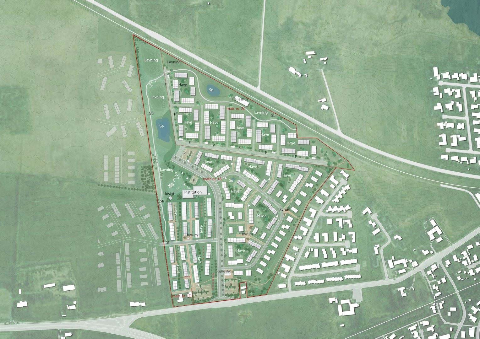 Den byggeretsgivende del af lokalplanen giver mulighed for boliger samt en institution. Boliger skal bestå af en blanding af tæt-lav bebyggelse i 1-2 etager og åben-lav bebyggelse i 1-2 etager. Udover det store grønne fælles naturområde etableres mindre fælles opholds- og friarealer imellem boligerne.