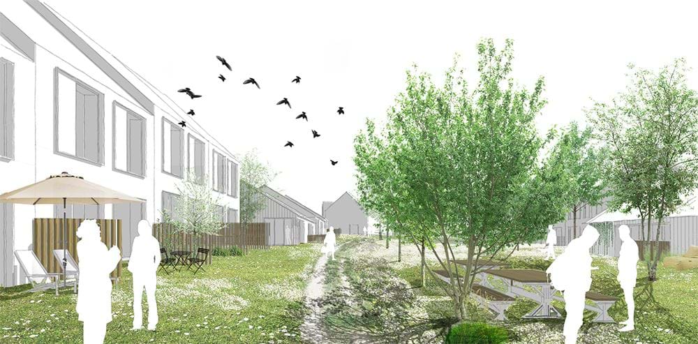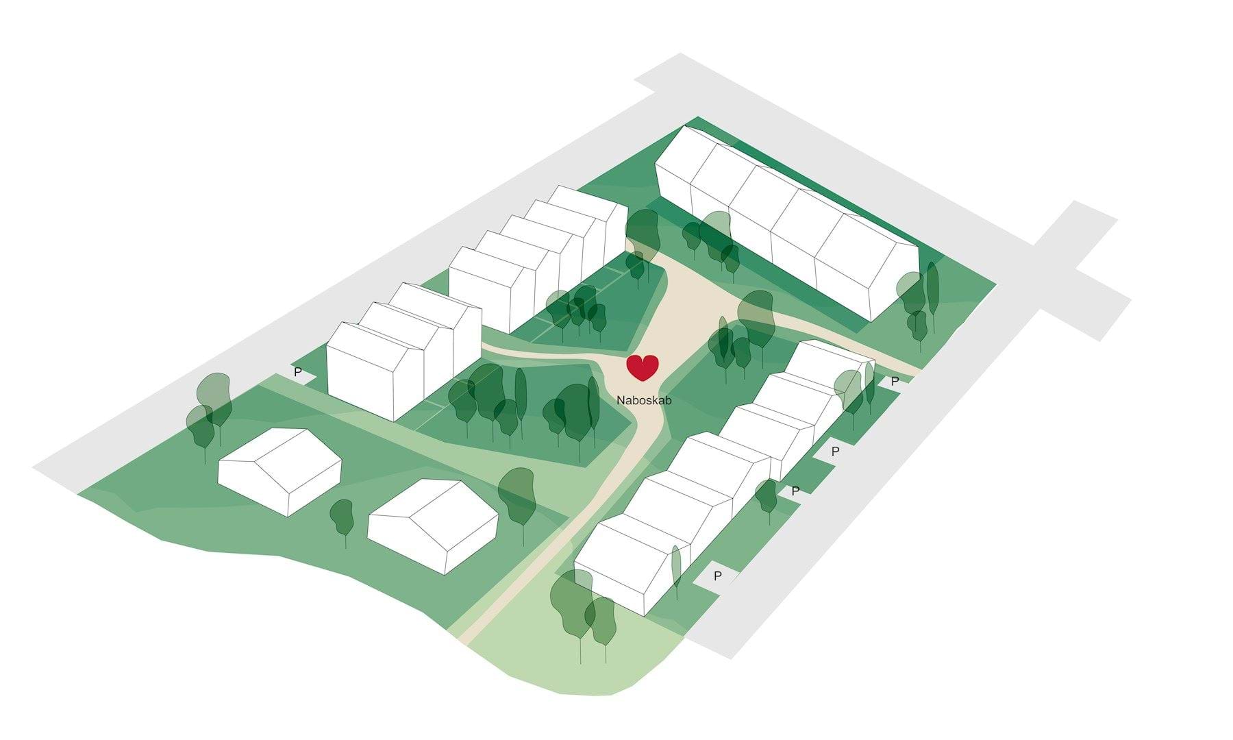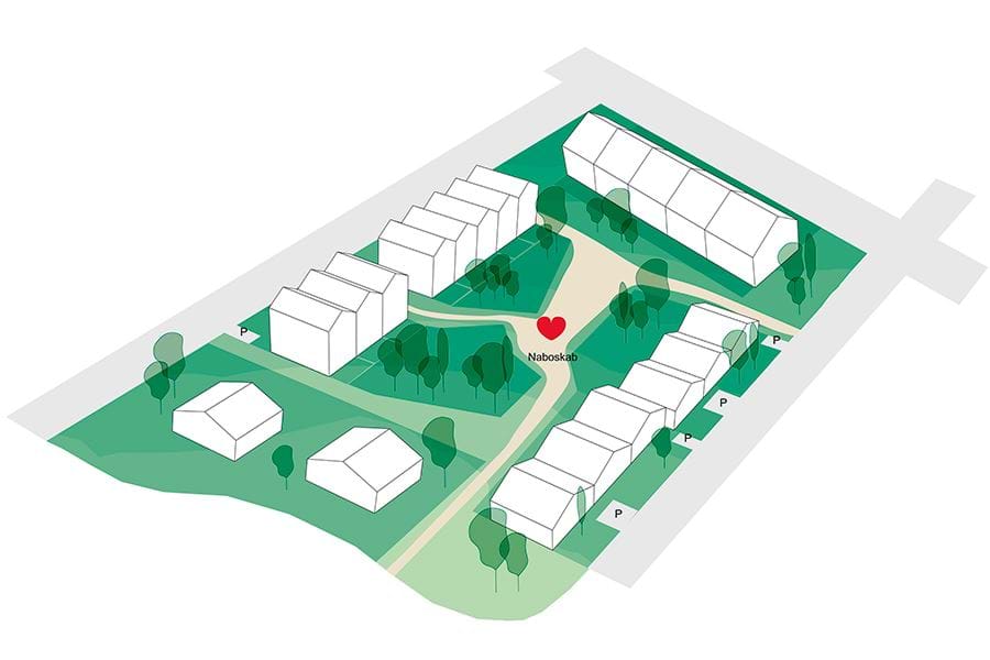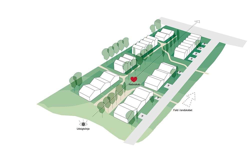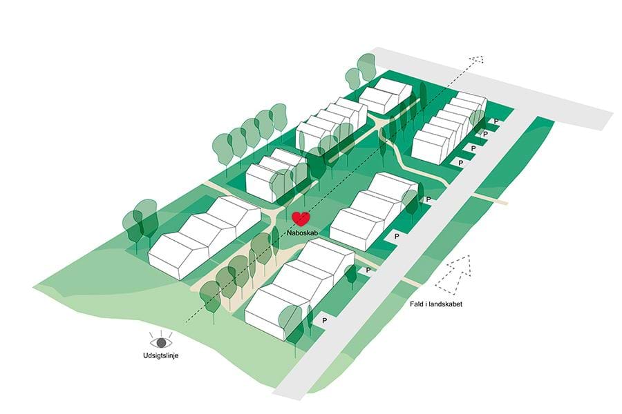 Figur 12: Princip for bebyggelsens placering i klynger med fælles opholdsareal i midten.