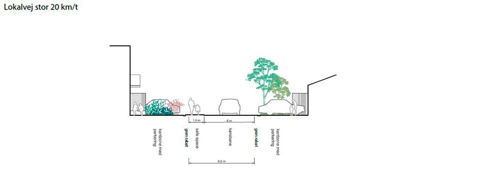 Større lokalveje skal foruden kørebane indeholde plads til hævet safe space for gående i den ene side af vejen, som vist i princippet på Figur 31. Safe space er med til at sinke hastigheden på trafikken, da vejene er indrettet med ét kørespor, der benyttes af trafikanter i begge retninger.