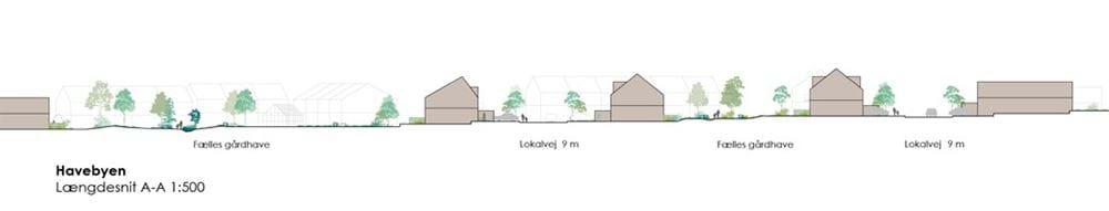 Figur 39: Principielt længdesnit for delområde 1, der viser de grønne nære fællesarealer imellem boligerne og kantzoner.