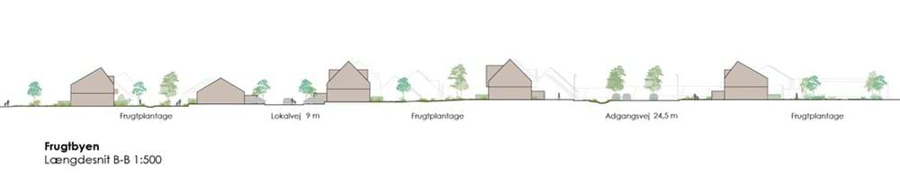 Kvarteret Frugtbyen ligger i områdets sydvestlige del. I dette område er der fra Kalundborgvej i dag fine kig med Fjorden, som skal bevares. Derfor etableres bebyggelsen her som stænger, der indrammer kig mod Fjorden. Strukturen er kendetegnet ved langstrakte rum og bebyggelser, der falder mod Fjorden.