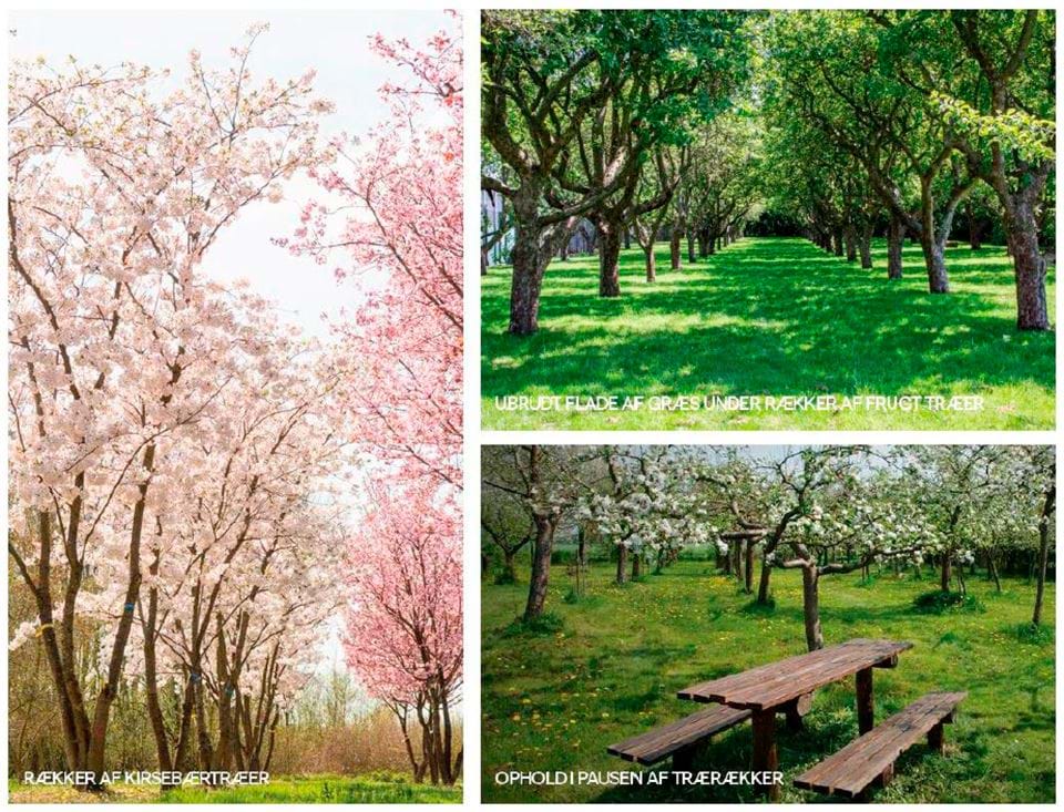 Beplantningen skal primært bestå af frugtbærende træer og buske med en bund af lave urter eller græsser.