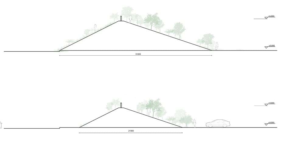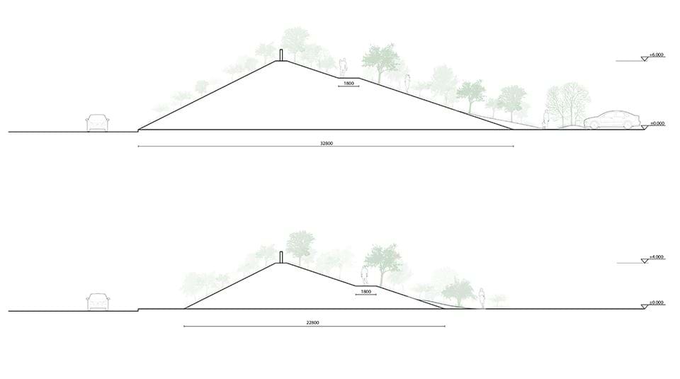 Ud mod Kalundborgvej/Tuse Lågevej skal volden udformes med en maks. hældning på 1:2, imens den ind mod lokalplanområdet må have en maksimal hældning på 1:3 for at sikre, at volden ikke fremstår så stejl ind mod bebyggelsen, hvor man færdes. På voldens side ind mod lokalplanområdet kan der etableres en sti. Se Figur 47 og Figur 48.