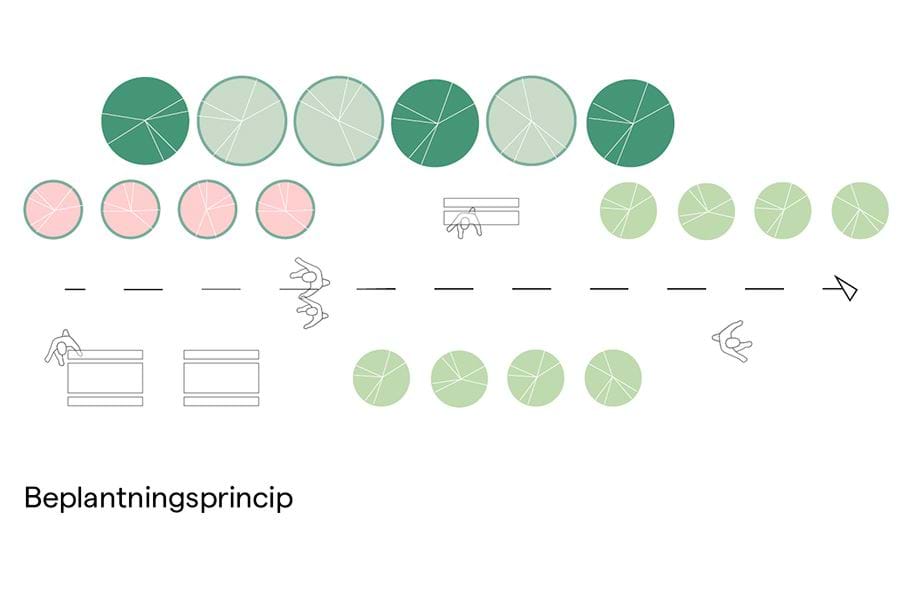 Figur 43: Beplantningsprincip for de fælles opholdsarealer i delområde 1; rækker af træer.