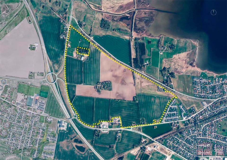 Figur 5: Afgrænsning af lokalplanområdet, der er markeret med stiplet gul streg. Sort skravering markerer området for den byggeretsgivende del af lokalplanen.